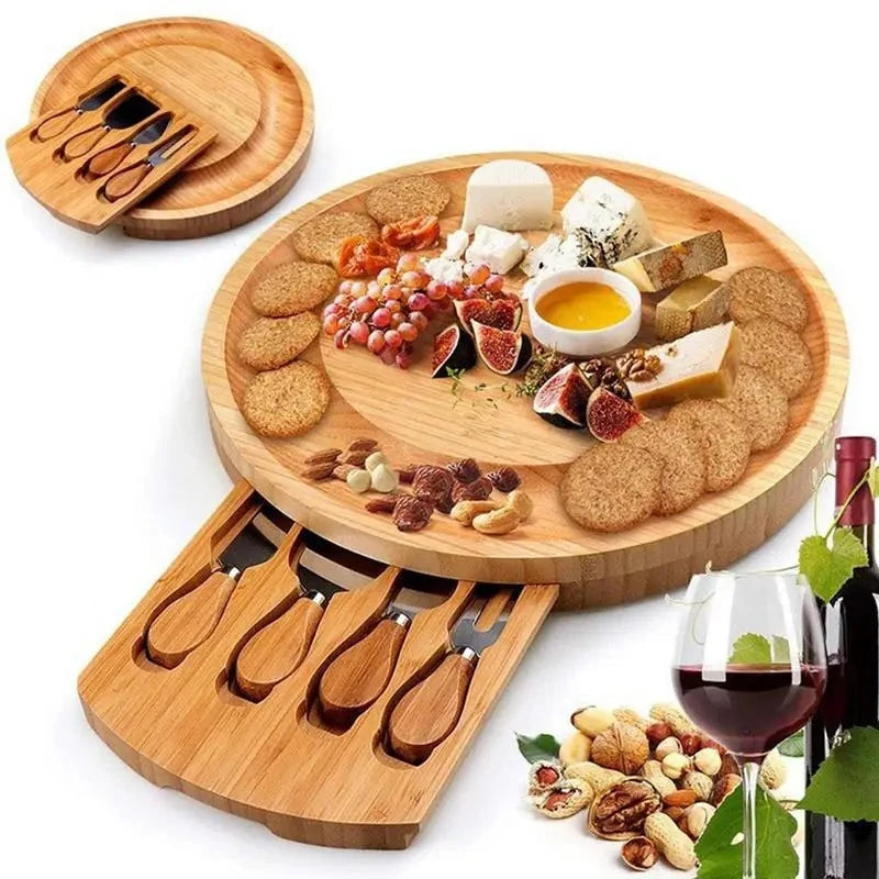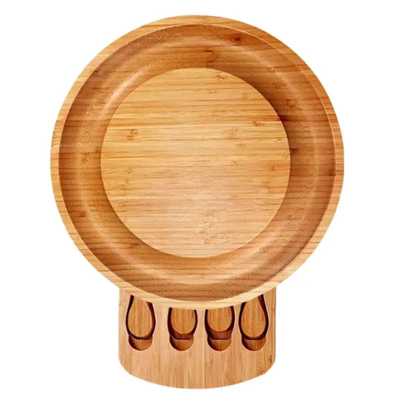 Bandeja para Frios em Madeira Bambu, perfeita para servir petiscos e queijos. Inclui 4 utensílios, proporcionando praticidade e sofisticação à sua mesa. Surpreenda os seus convidados com esta peça única e sustentável.