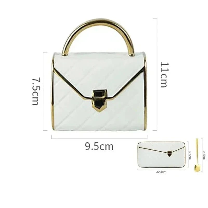 Conjunto Criativo Caneca Formato Bolsa em Porcelana, com design elegante e sofisticado, este conjunto inclui uma charmosa caneca em formato de bolsa, uma colher e um pires, tudo feito em porcelana de alta qualidade.