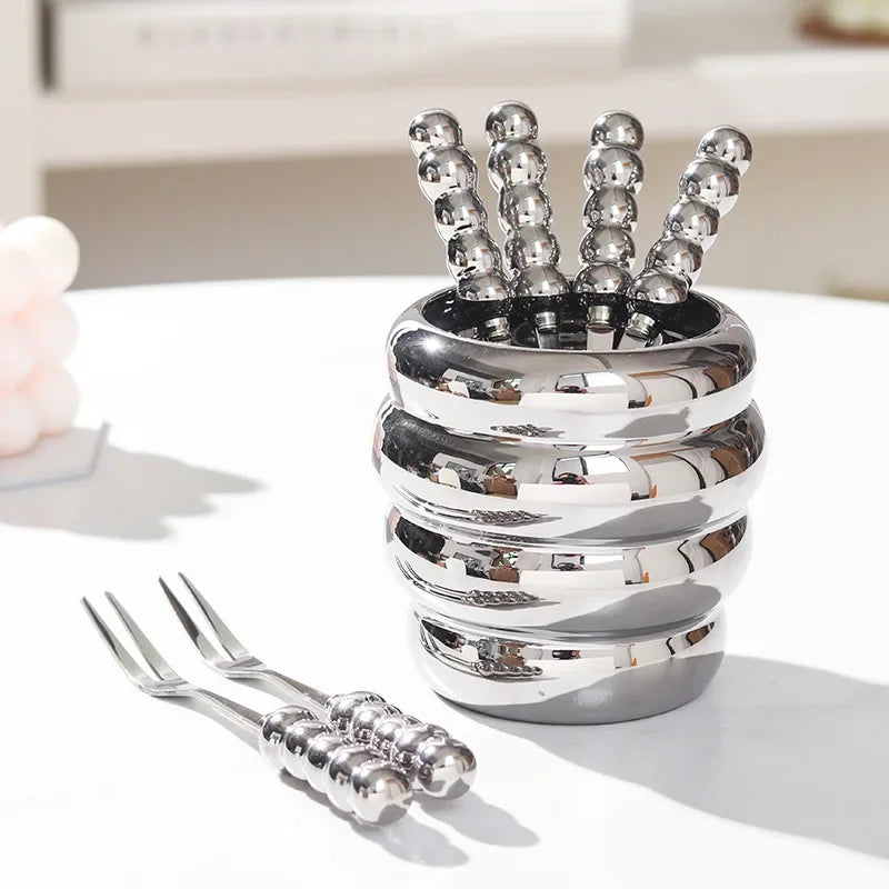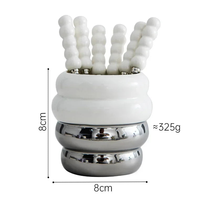 Eleve a sofisticação da sua mesa com o nosso Conjunto Garfos para Frutas, acompanhado por um elegante suporte de cerâmica. Este conjunto é a escolha perfeita para quem aprecia o design refinado e a funcionalidade em um só produto.