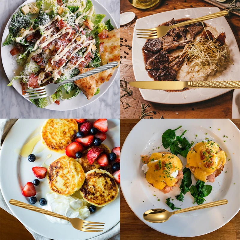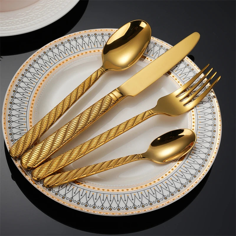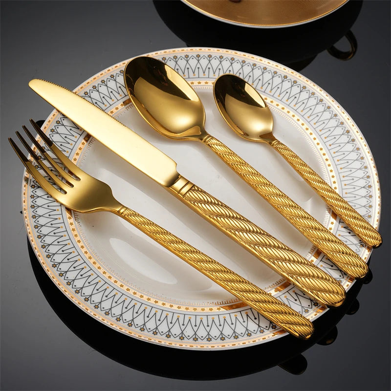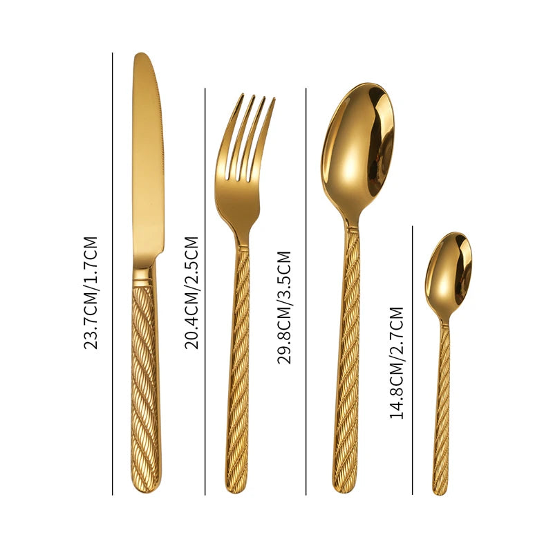 Conjunto de Talheres Gold em Aço Inox, composto por 4 peças, une design sofisticado e alta resistência. Com acabamento dourado elegante, oferece um toque de luxo à sua mesa, ideal para jantares especiais ou para quem aprecia detalhes refinados no dia a dia.