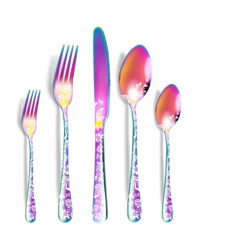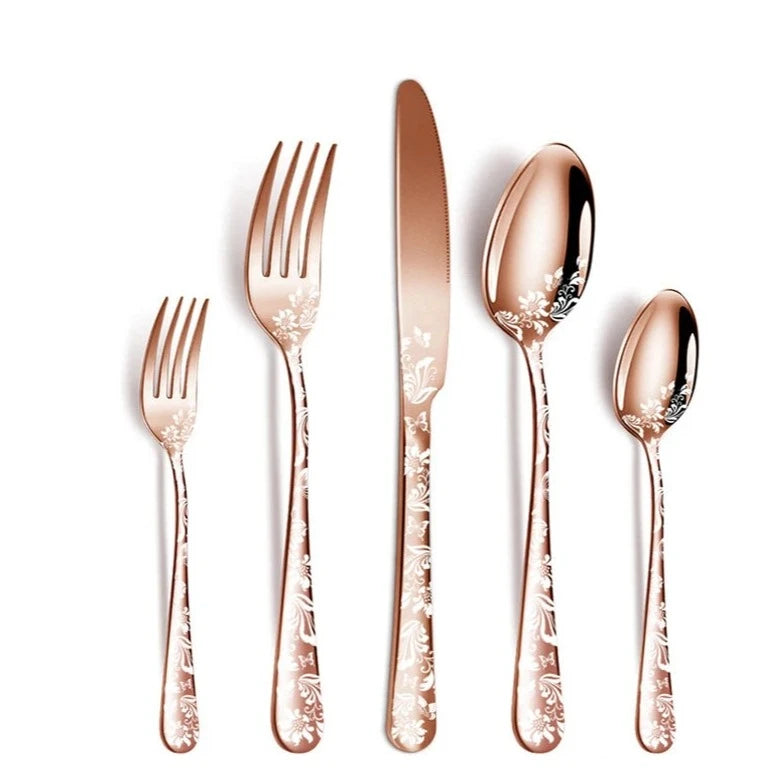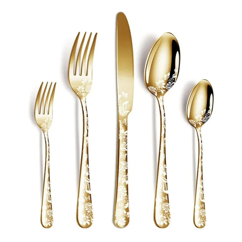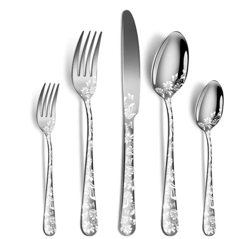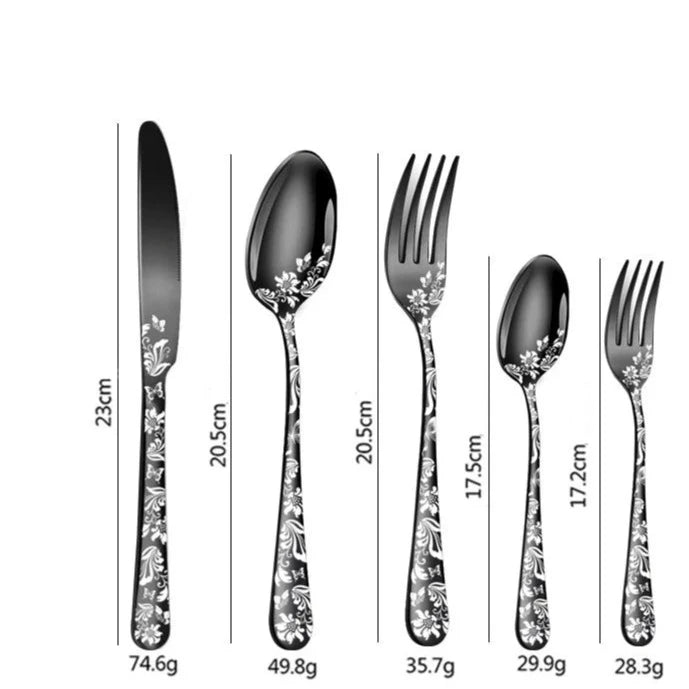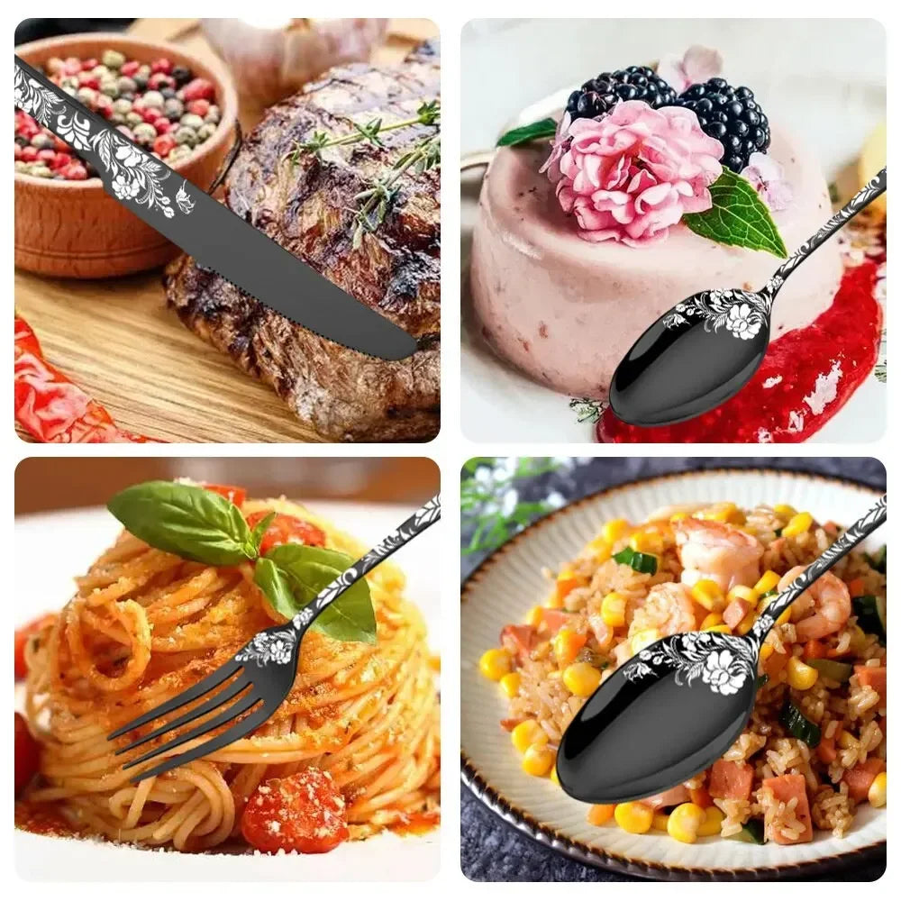 O pacote inclui: 4 Facas, 4 colheres, 4 colheres de chá, 4 garfos, 4 garfos para bolo