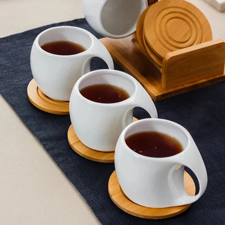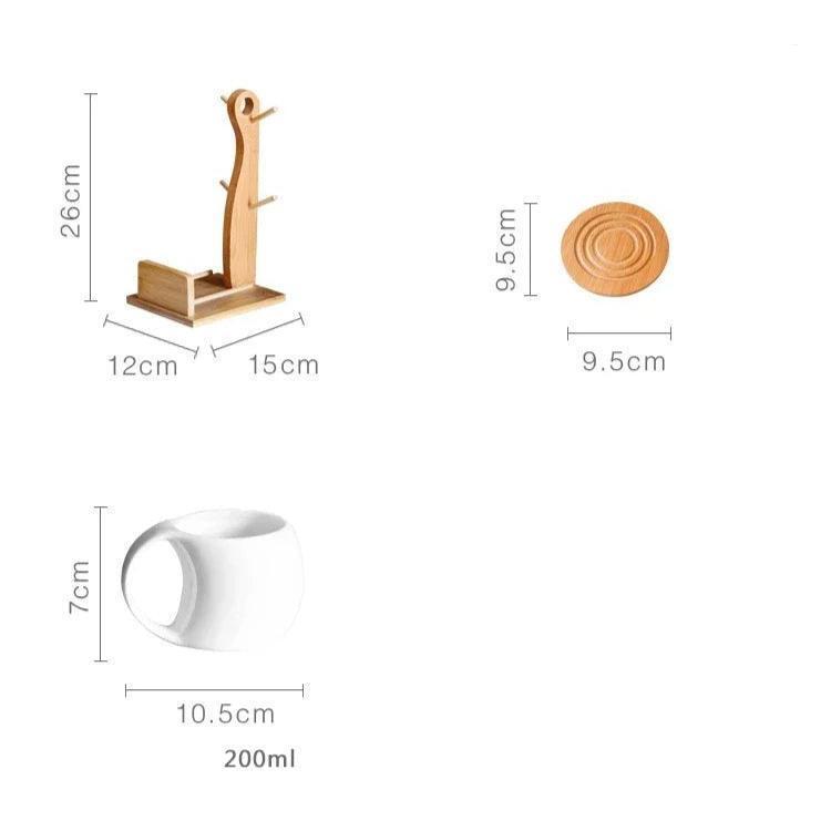 Conjunto Xícaras Modena, composto por xícaras de cerâmica, pires e suporte de madeira, este conjunto exclusivo oferece organização e praticidade à sua mesa.