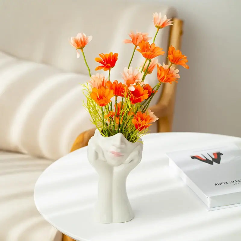 Escultura Rosto Feminino em Cerâmica. Com expressão serena e as mãos no rosto, esta peça única é perfeita para adicionar um toque especial à sua decoração.