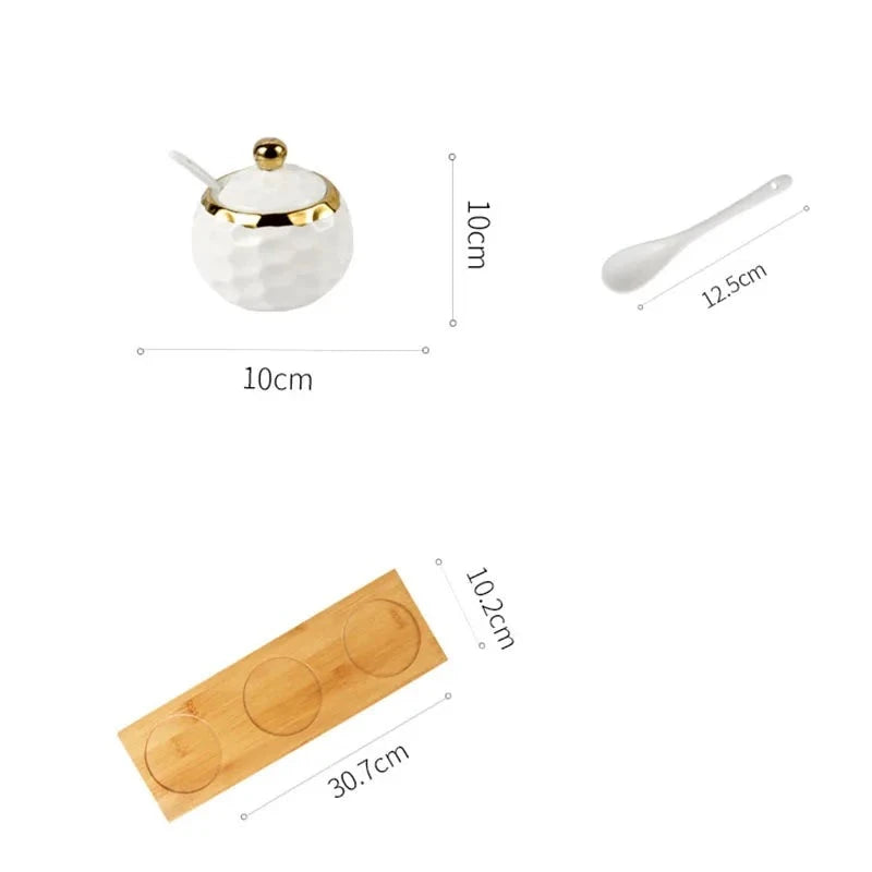 O pacote contém: 3 Porta temperos com tampa, 3 colheres, 1 base