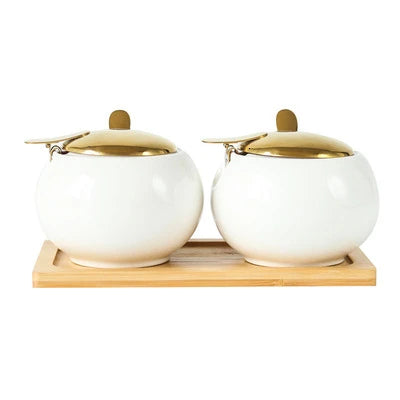 O pacote contém: 2 Porta condimentos, 2 colheres, 1 bandeja em madeira