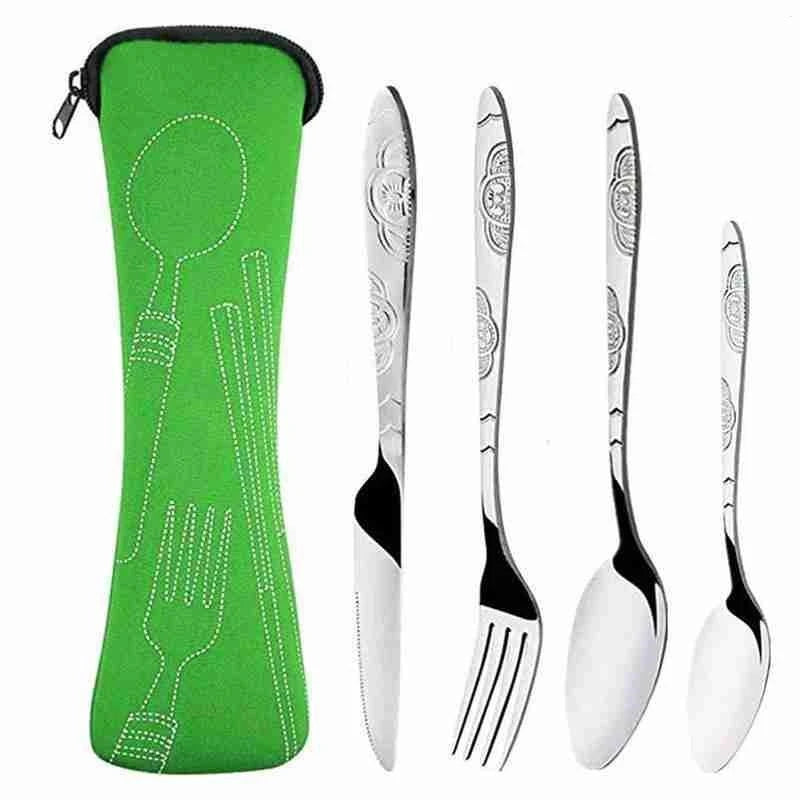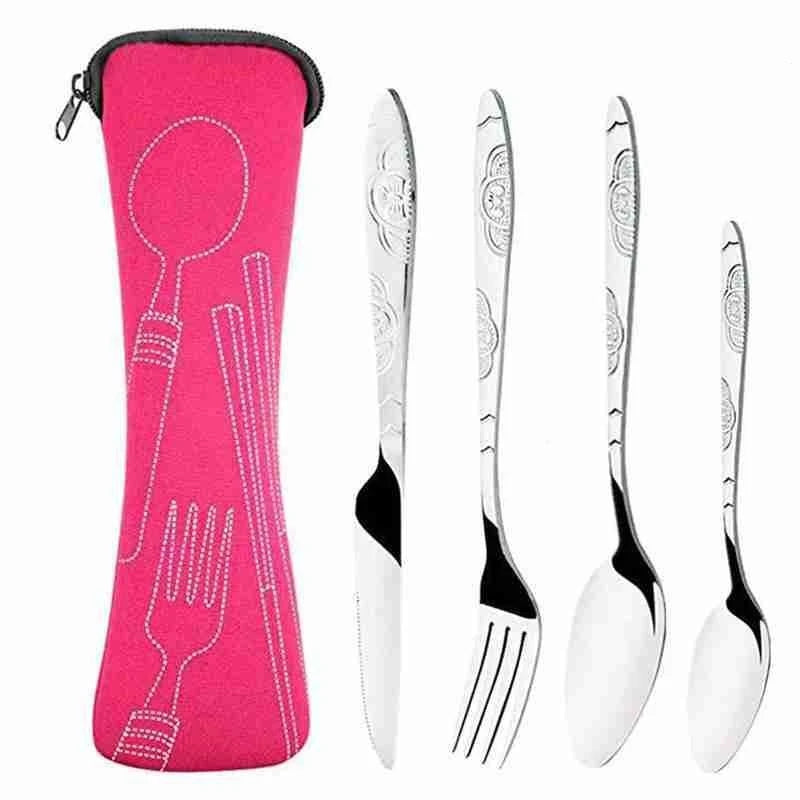 Kit Talheres Desenhado em Metal, composto por 4 peças e uma bolsa com zíper, este conjunto é perfeito para viagens, piqueniques ou até mesmo para o dia a dia.