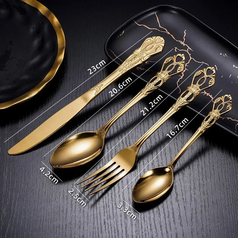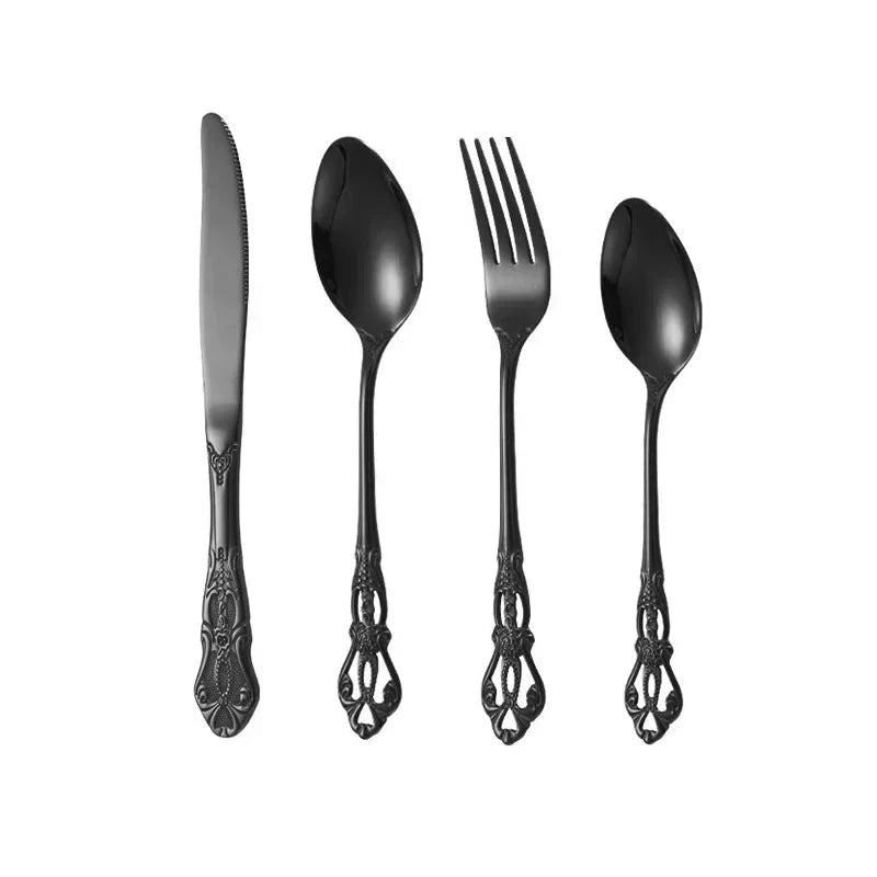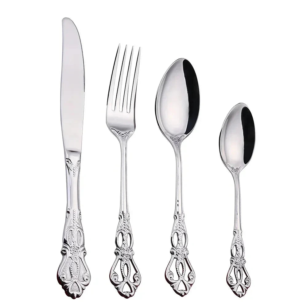 Kit Talheres Retrô em Inox, composto por 4 peças, combina design clássico com a durabilidade do aço inoxidável. Ideal para quem valoriza elegância e funcionalidade à mesa, oferece uma experiência refinada em cada refeição, unindo estilo vintage e praticidade moderna.