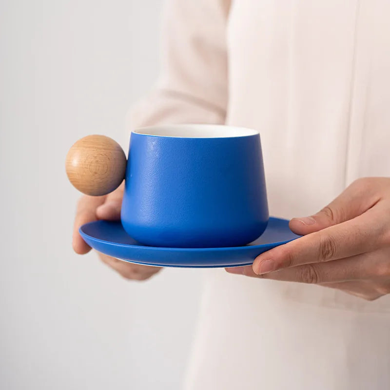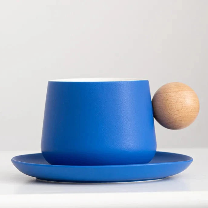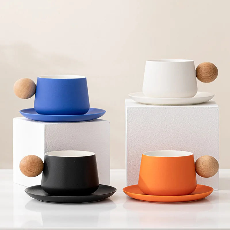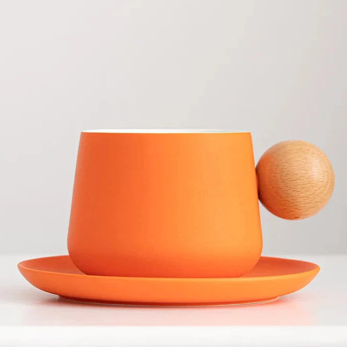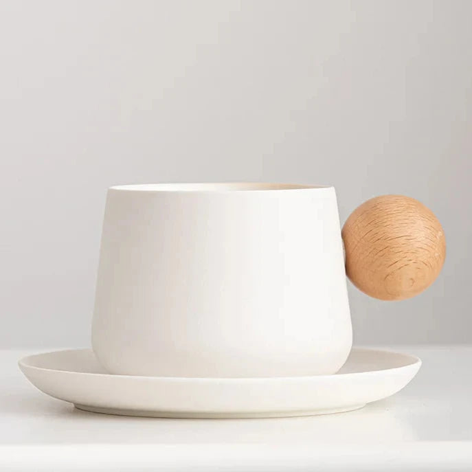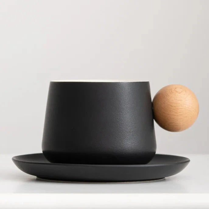 Kit Xícara Joy em Cerâmica com cabo em madeira e um pires, é a união perfeita de funcionalidade e elegância moderna.