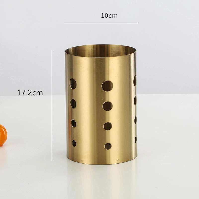 Porta Utensílios Gold em Inox oferece a combinação perfeita de luxo e praticidade para sua cozinha. Feito em aço inoxidável de alta qualidade com um deslumbrante acabamento dourado, ele oferece uma maneira elegante de manter seus utensílios organizados e ao alcance das mãos.