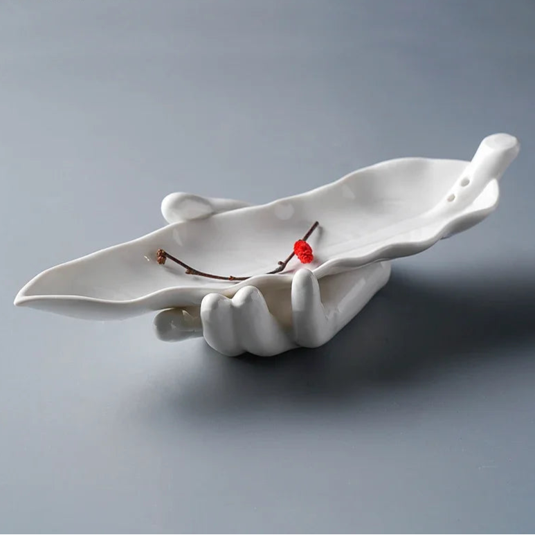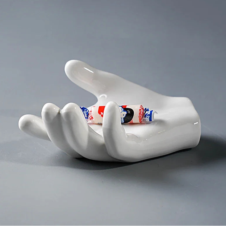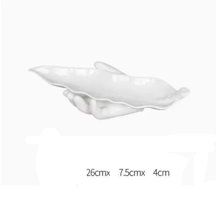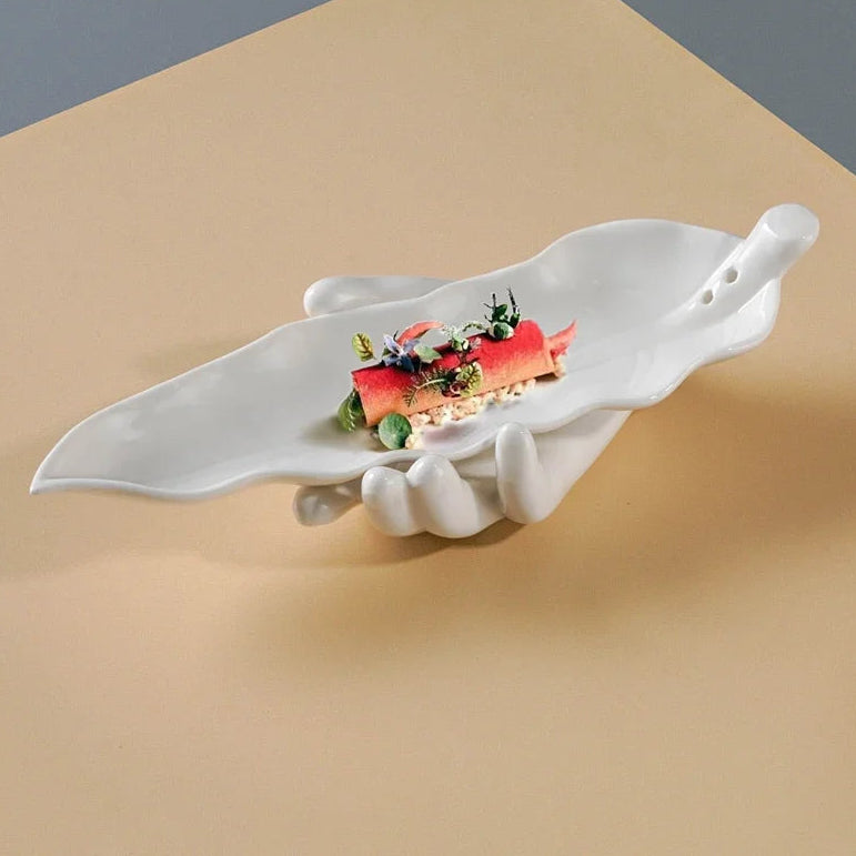 Prato Decorativo Branco, em formato de mão segurando uma folha, é perfeito para servir sobremesas com elegância. Seu design sofisticado transforma a apresentação dos doces, adicionando um toque artístico e delicado à mesa. Ideal para ocasiões especiais ou para quem aprecia detalhes refinados na decoração de mesa.