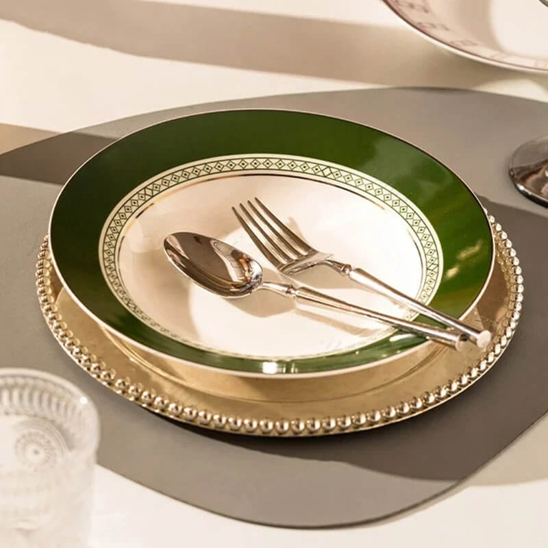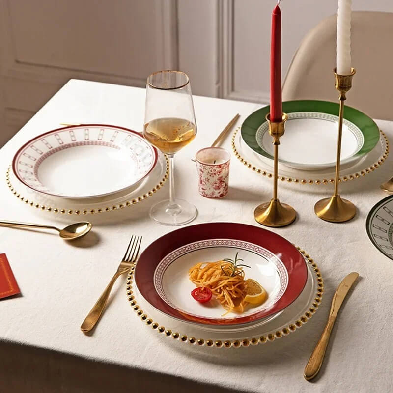 Design Elegante: Bordas coloridas e detalhes clássicos que adicionam um toque de sofisticação à mesa.