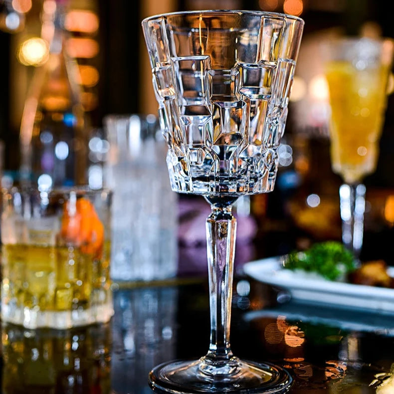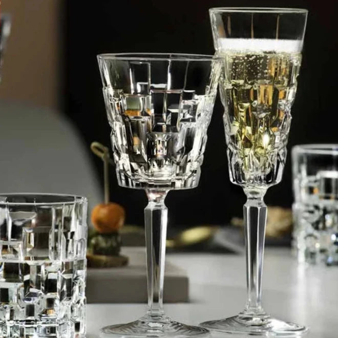 Taças de Cristal com Alto Relevo Retangular unem design contemporâneo e sofisticação, destacando-se pelo relevo elegante que adiciona textura e charme. Perfeitas para brindar momentos especiais, proporcionam uma experiência visual e tátil única, elevando o estilo da sua mesa com requinte e exclusividade.