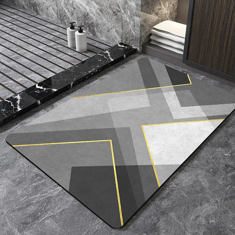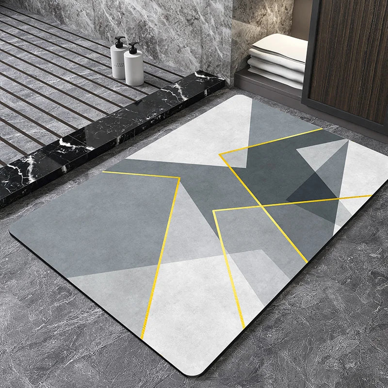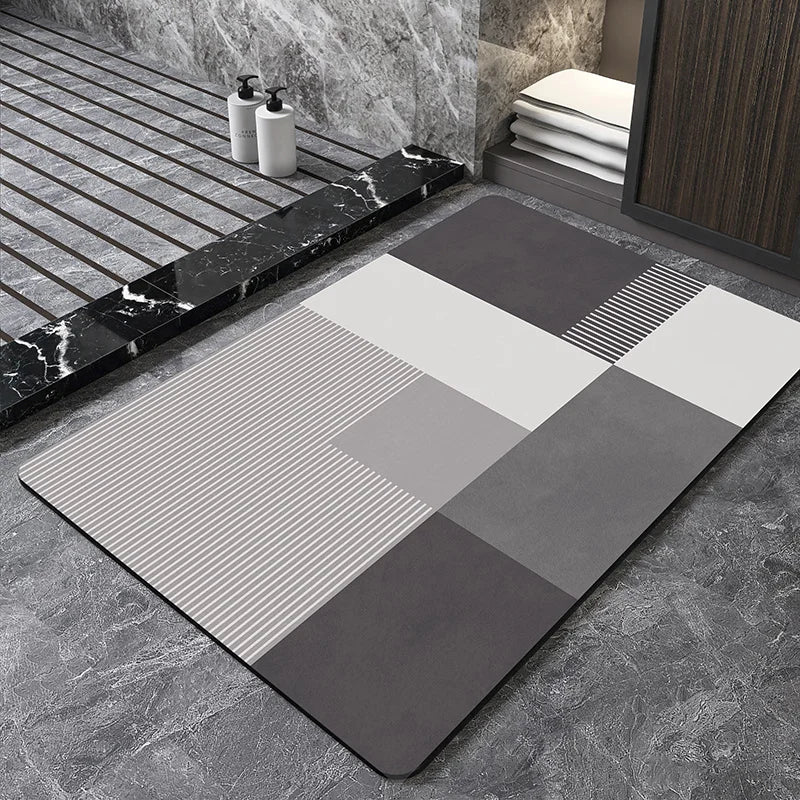 Tapete Geométrico de Secagem Rápida, com design moderno e material de camurça garantem absorção eficiente, mantendo o banheiro seco e seguro.