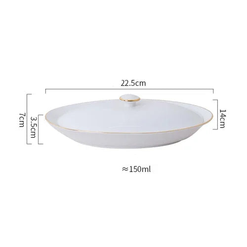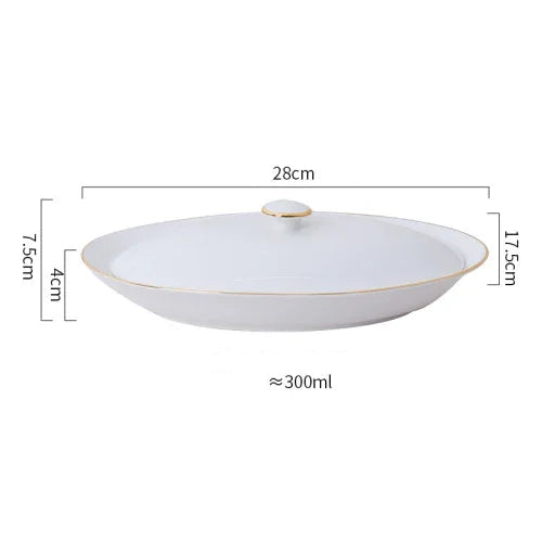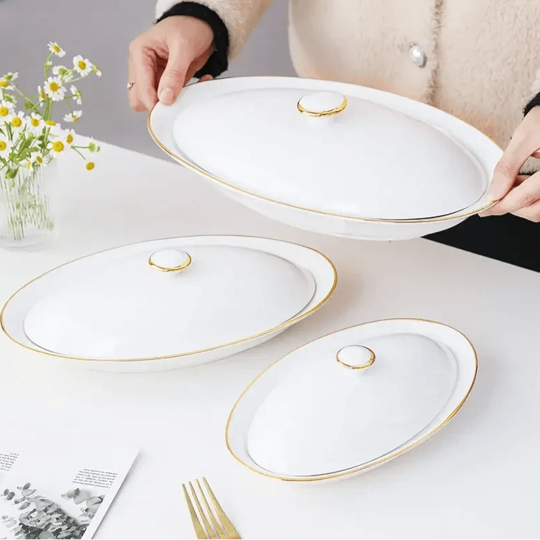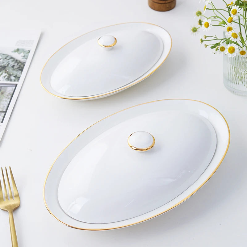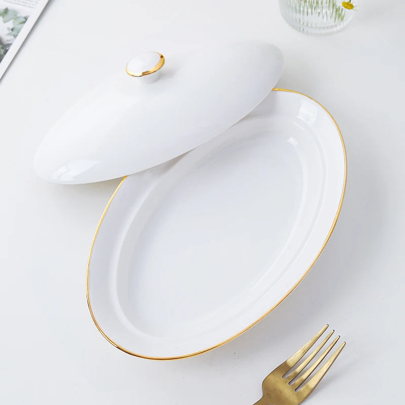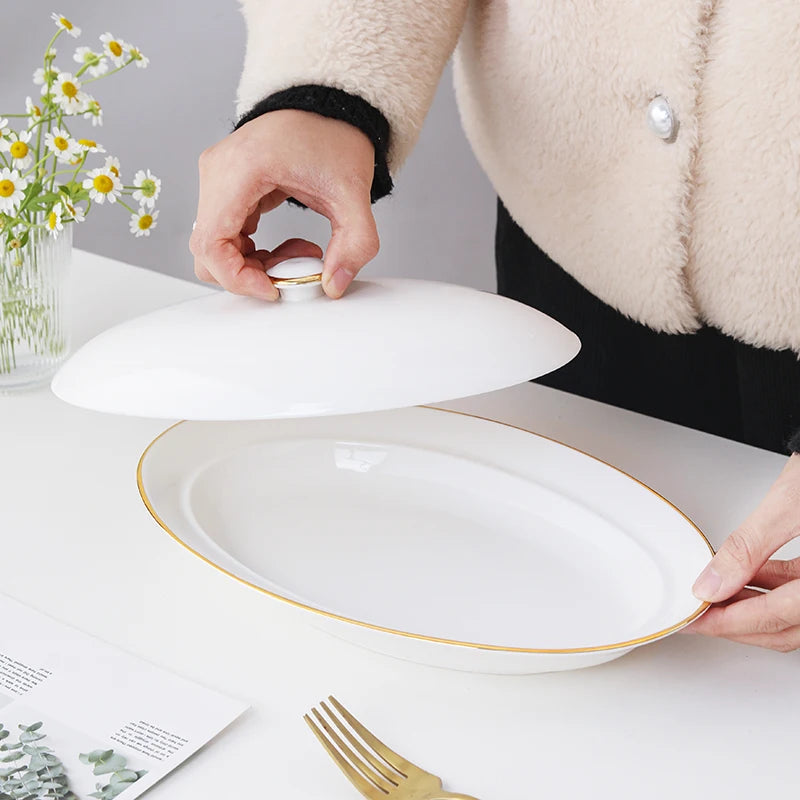 Travessa Oval de Cerâmica Luxo com Tampa e Acabamento Dourado