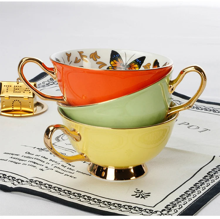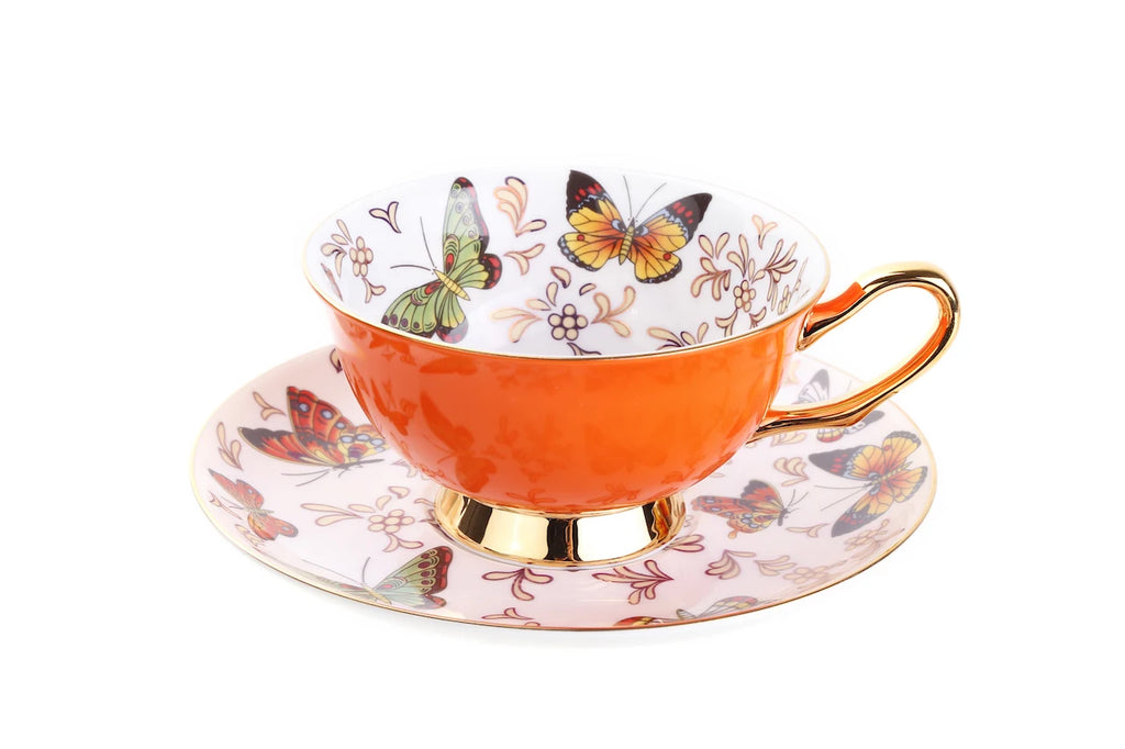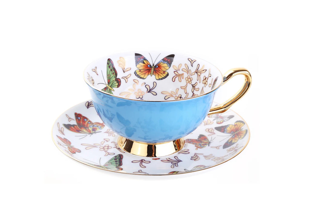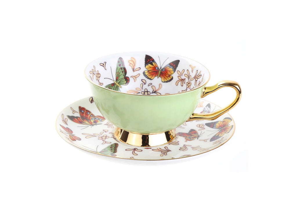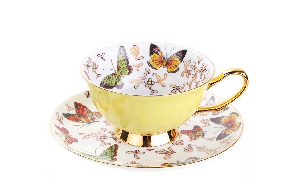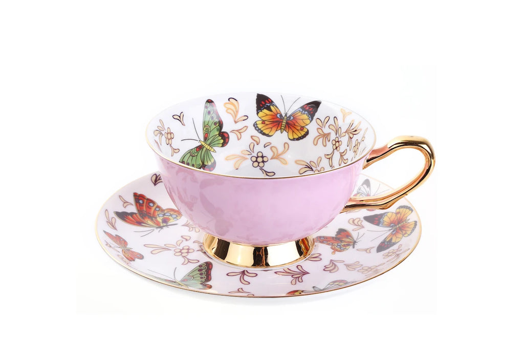 Xícara e Pires Butterfly, descubra a sofisticação da porcelana, com seu design delicado de borboletas que simboliza beleza e transformação.