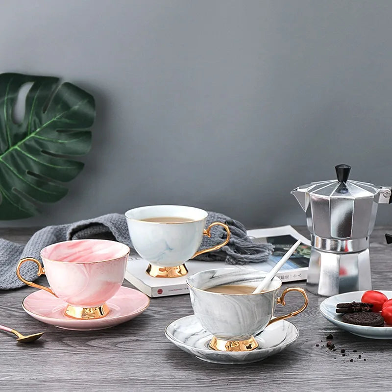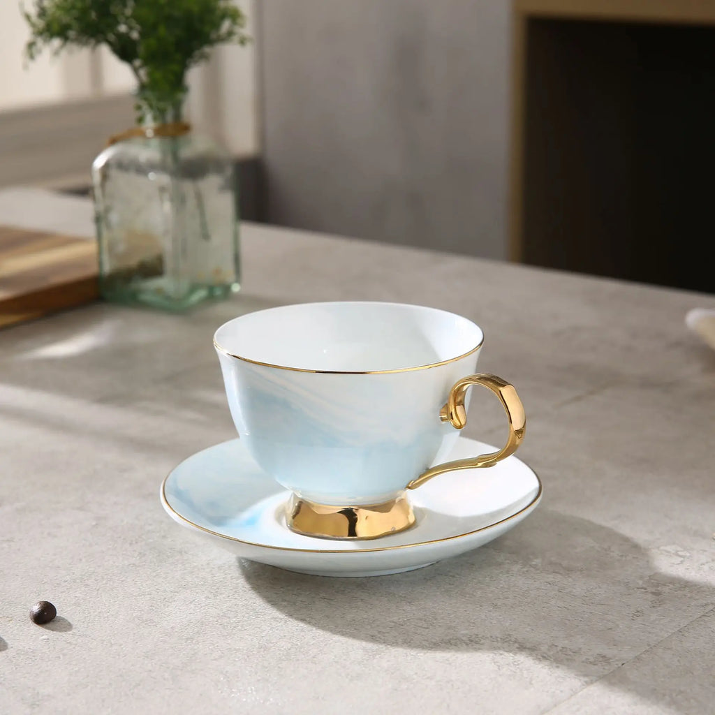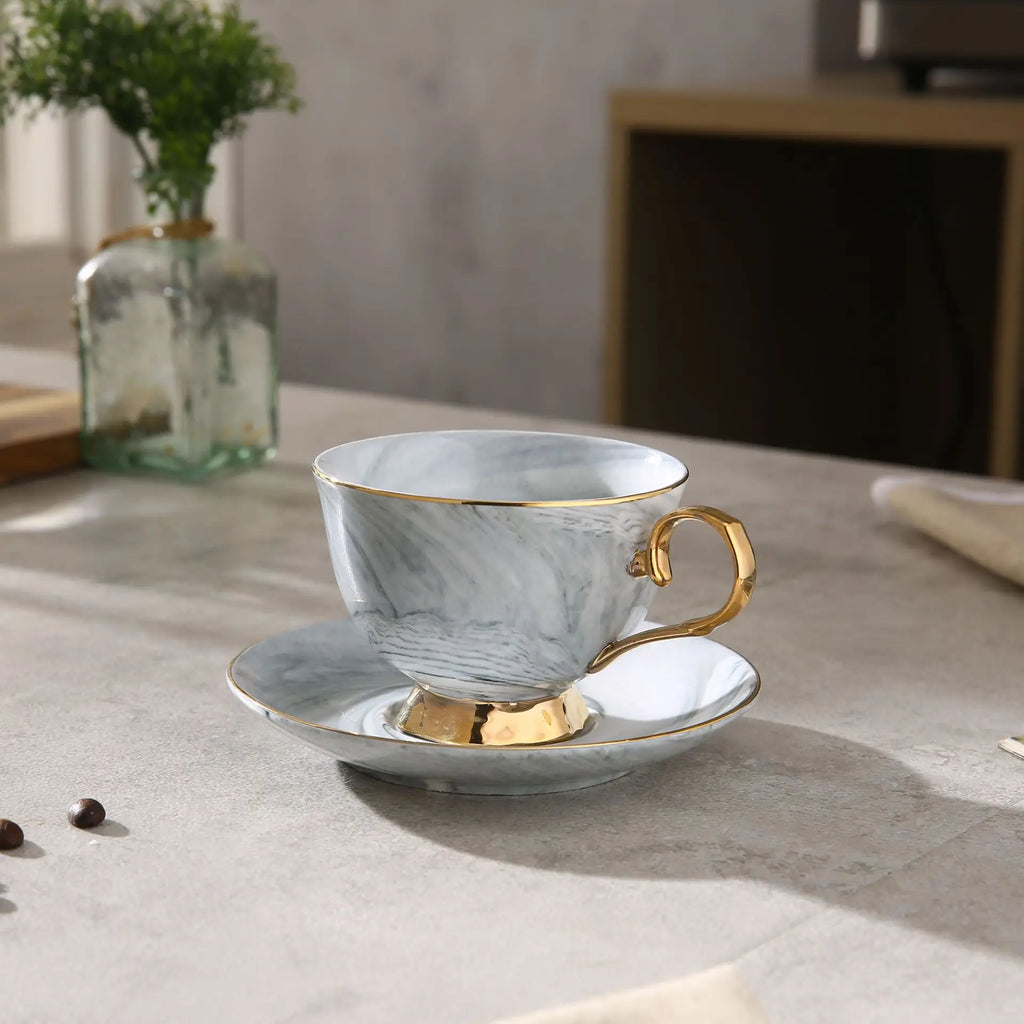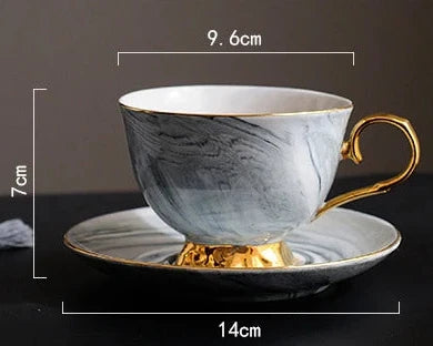 Xícara e Pires Mármore Luxo, com capacidade de 300ml, é confeccionada em cerâmica refinada que alia beleza e resistência. Seu acabamento marmorizado traz um toque de exclusividade e sofisticação, perfeito para valorizar momentos de café ou chá com elegância e estilo.
